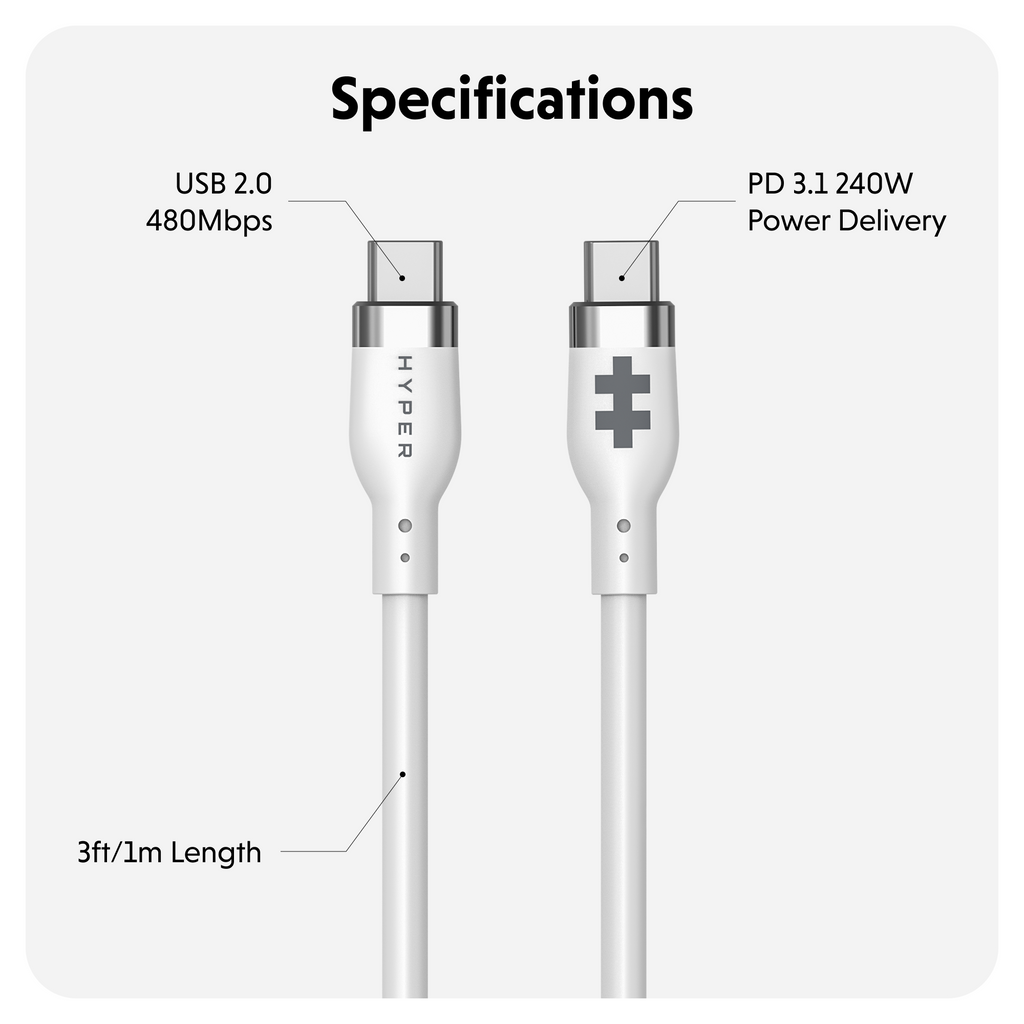 HyperJuice 240W Silicone USB-C to USB-C Cable (6ft/2m) – White